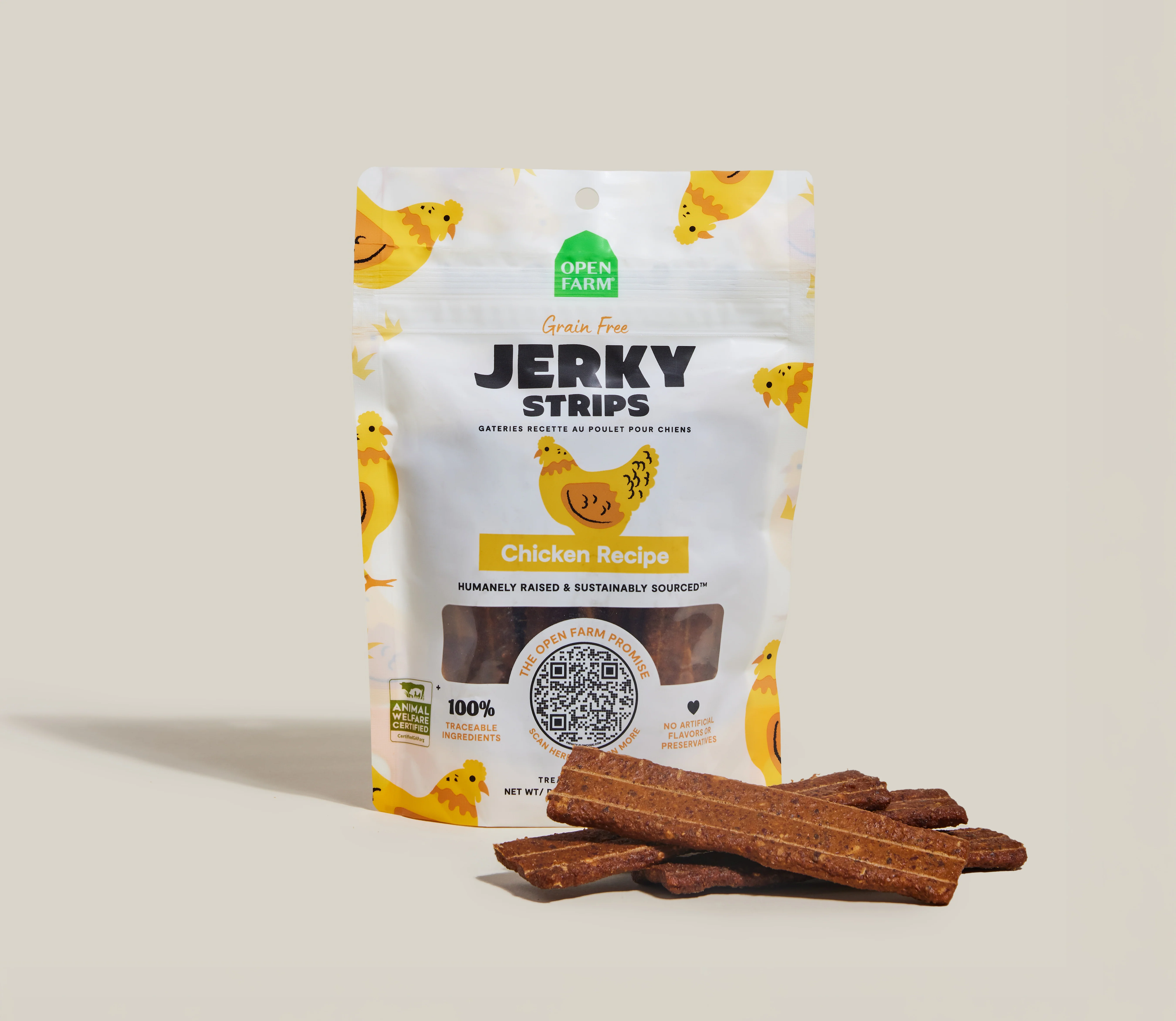 These jerky strips feature humanely-raised chicken to deliver an incredible taste your dog will crave! As with all Open Farm products, our ethically sourced ingredients are 100% traceable. Our jerky strips are crafted in a way that respects animal welfare and our planet. Approximately 7-8 strips per bag.