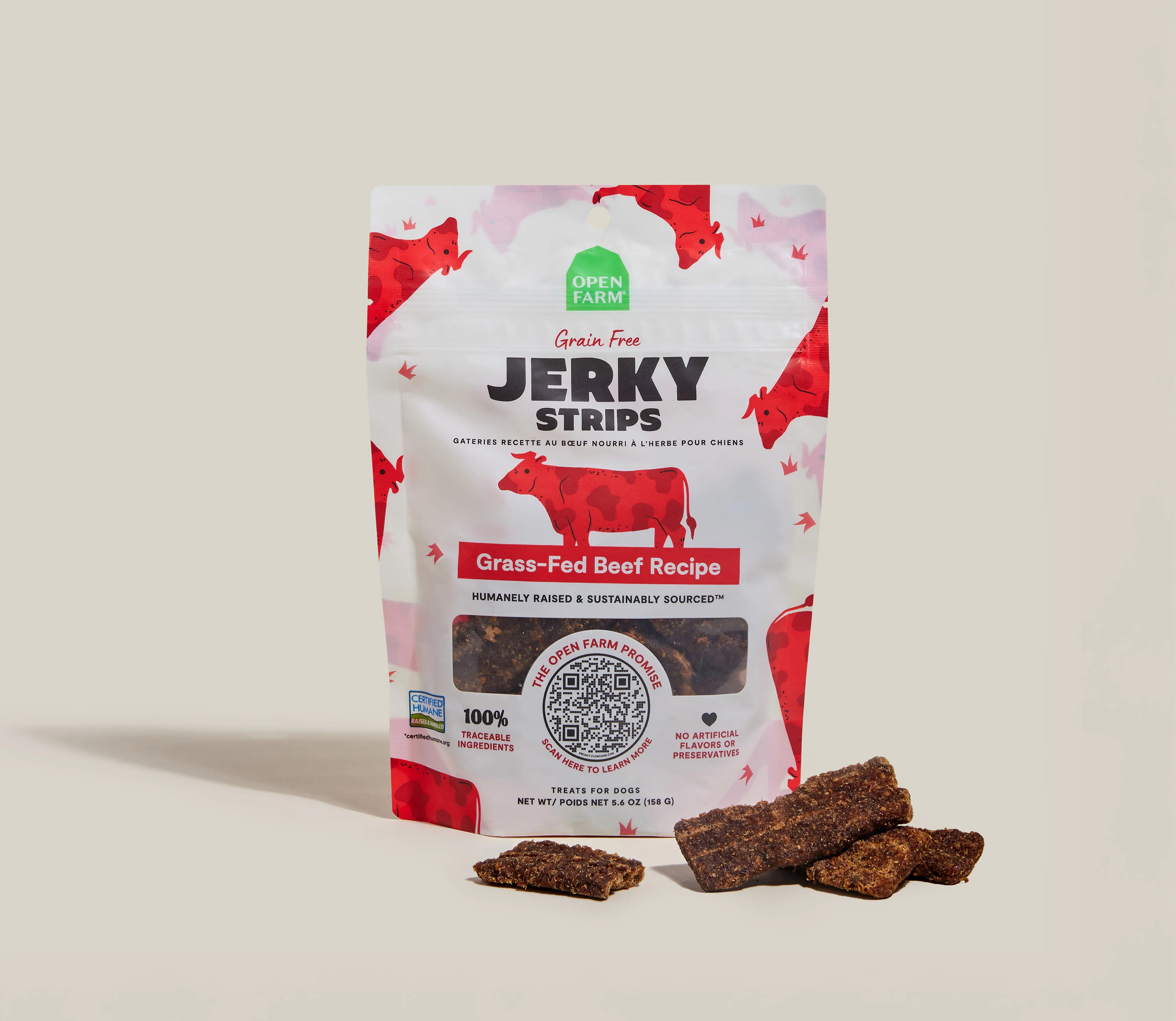 Open Farm grass-fed beef jerky strips feature Certified Humane beef to deliver an incredible taste your dog will crave! As with all Open Farm products, our ethically sourced ingredients are 100% traceable. Our jerky strips are crafted in a way that respects animal welfare and our planet. Approximately 7-8 strips per bag.
